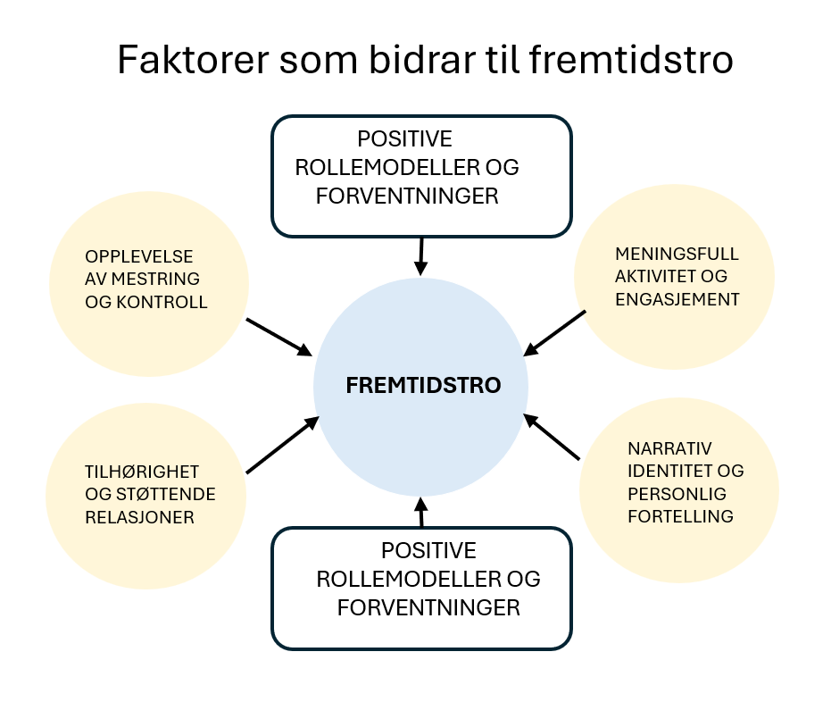 Figur: Oversikt over faktorer som har dokumentert betydning for unges fremtidstro. Denne artikkelen handler om narrativ identitet og personlig fortelling. (Øyeflaten, 2025).